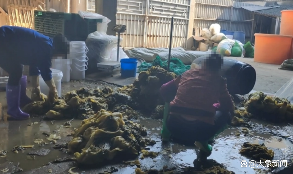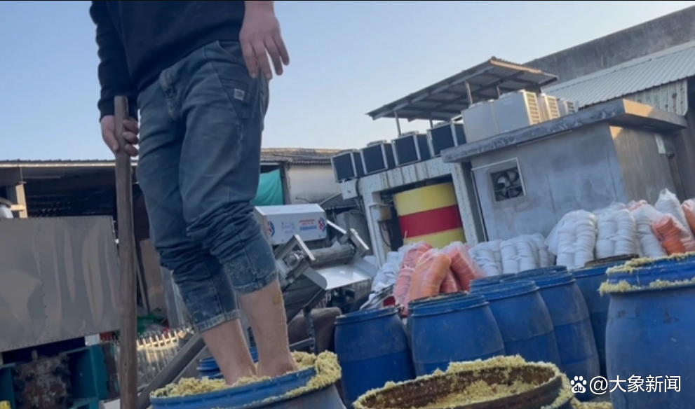 汕头再现工人赤脚踩腌菜,芥菜泡污水扔路边